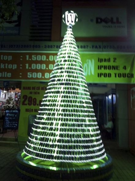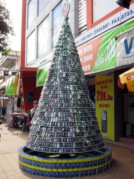 这家商店名为Westcom Electronics,位于越南南部城市美托。该商店经理表示,10位工人花了两周时间才搭建起这棵圣诞手机树。希望此举能够唤起人们对有害废弃物的认识,提高环保责任感。